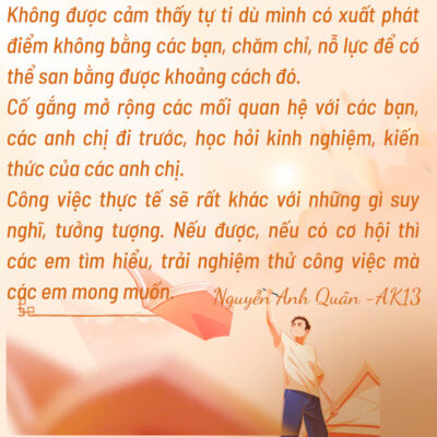 Anh Quân (AK13) – hiện là sinh viên năm 4 đại học – dành cho chúng em những lời khuyên rất thật từ chính môi trường đại học: Không bao giờ được tự ti về xuất phát điểm của mình. Sự chăm chỉ có thể san bằng mọi khoảng cách. Hãy chủ động kết nối, học hỏi từ bạn bè và các anh chị đi trước. Và đặc biệt, “công việc thực tế rất khác với tưởng tượng”, vì vậy nếu có cơ hội, hãy trải nghiệm sớm để hiểu xem mình thật sự hợp với điều gì.