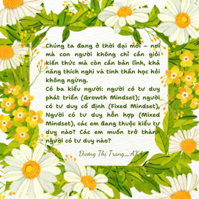 Chị cũng nhắc đến nhu cầu việc làm trong thời đại mới – nơi mà con người không chỉ cần giỏi kiến thức mà còn cần bản lĩnh, khả năng thích nghi và tinh thần học hỏi không ngừng. Chị nói trên hành trình ấy luôn có ba kiểu người: người có tư duy phát triển (Growth Mindset); người có tư duy cố định (Fixed Mindset), Người có tư duy hỗn hợp (Mixed Mindset), các em đang thuộc kiểu tư duy nào? Các em muốn trở thành người có tư duy nào?