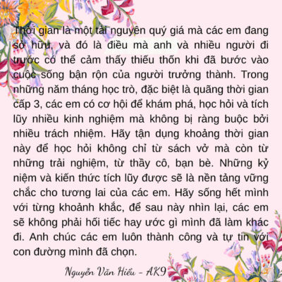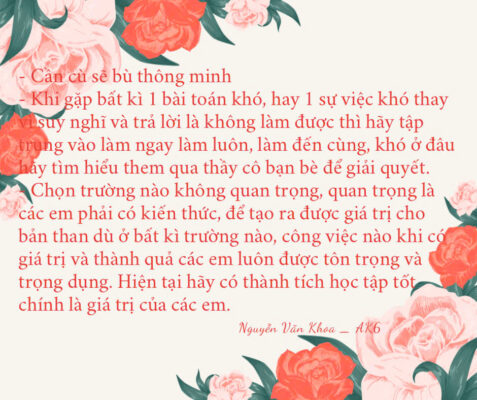 Anh Khoa (AK6) lại khiến chúng em mở mang thêm một góc nhìn mới về học tập – một góc nhìn rất “đời”, rất cụ thể và đầy thực tế: Cần cù bù thông minh; .Khi gặp khó khăn, đừng vội nói “không làm được”, hãy bắt tay vào làm ngay và hỏi thêm thầy cô, bạn bè; Trường nào không quan trọng, quan trọng là giá trị bản thân.