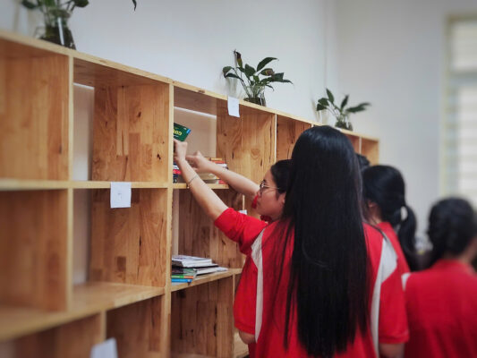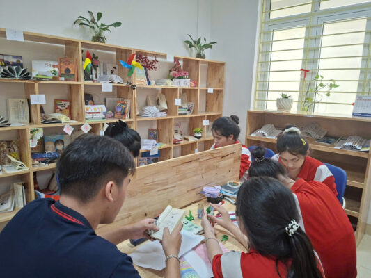 Thầy cô: Không chỉ tư vấn, hướng dẫn các em trang trí, các thầy cô còn trực tiếp cùng các em nghiên cứu, tìm tòi những cuốn sách mới, tạo nên hình ảnh đẹp về sự kết nối giữa các thế hệ qua trang sách.