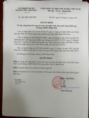 Nhà trường trân trọng thông báo nội dung bổ sung dự toán,
