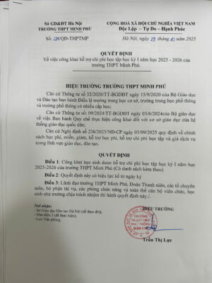 Thực hiện quy chế công khai đối với cơ sở giáo dục, Trường THPT Minh Phú trân trọng thông báo quyết định phê duyệt danh sách học sinh được hưởng hỗ trợ chi phí học tập Học kỳ I, năm học 2025 – 2026.