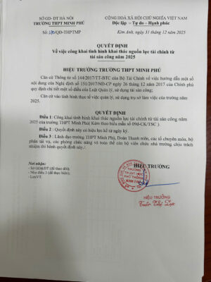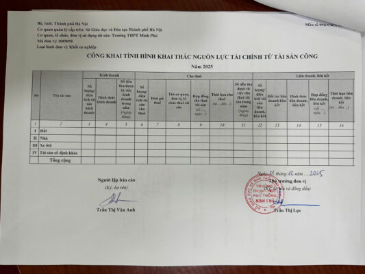 Nhằm thực hiện quy chế công khai tài chính và tăng cường sự giám sát của cán bộ, giáo viên, nhân viên đối với việc sử dụng tài sản tại đơn vị, Trường THPT Minh Phú trân trọng thông báo công khai tình hình khai thác nguồn lực tài chính từ tài sản công năm 2025.