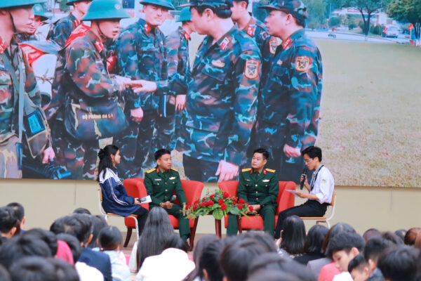 Phần Talk Show là điểm nhấn lay động nhất của chuyên đề. Em MC Hiệp (Lớp 12A3) đã khéo léo đặt những câu hỏi sâu sắc tới các chú, các anh bộ đội.