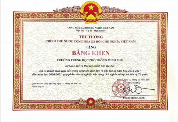 Trường THPT Minh Phú trân trọng thông báo và chia sẻ niềm vui, niềm tự hào tới toàn thể cán bộ, giáo viên, nhân viên, học sinh, phụ huynh và các thế hệ học sinh của nhà trường: Ngày 11 tháng 11 năm 2021, Trường THPT Minh Phú đã vinh dự được Thủ tướng Chính phủ nước Cộng hòa xã hội chủ nghĩa Việt Nam tặng Bằng khen vì đã có thành tích xuất sắc trong công tác giáo dục và đào tạo từ năm học 2016 – 2017 đến năm học 2020 – 2021, góp phần vào sự nghiệp xây dựng chủ nghĩa xã hội và bảo vệ Tổ quốc.